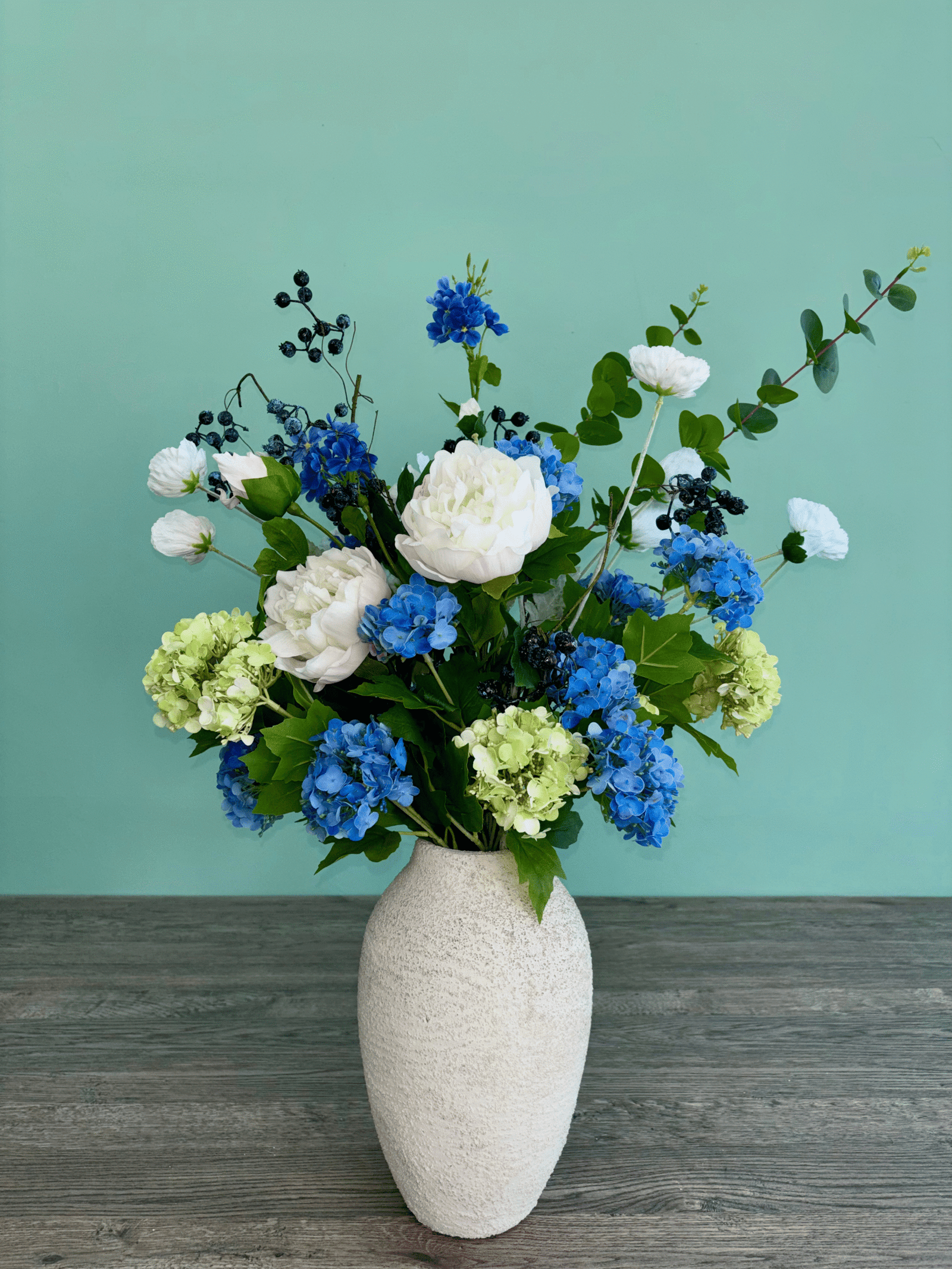 The harmonious balance of cool blue tones with creamy whites and layered greenery creates depth, texture, and graceful movement. Perfect for living rooms, bedrooms, dining areas, or statement entrance displays, this arrangement brings a peaceful yet luxurious presence to any interior.