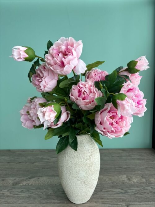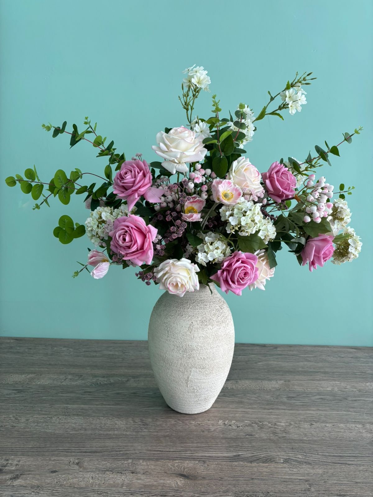 The harmonious pairing of gentle pink tones with fresh greenery creates depth, movement, and a sense of natural elegance. Perfect for bedrooms, dressing spaces, dining areas, or as a statement centrepiece, this arrangement brings light, femininity, and understated luxury to any interior.