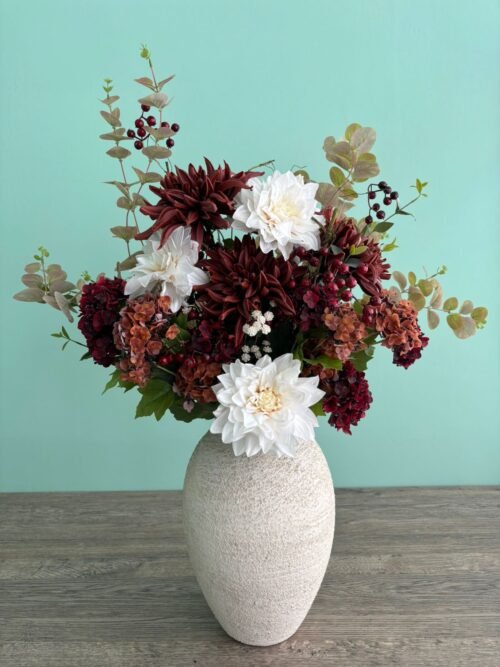 The deep crimson tones create depth and intensity, while soft botanical accents add texture and graceful movement. Perfect for grand interiors, romantic settings, dining spaces, or as a showstopping centrepiece, this arrangement brings classic luxury into any room.
