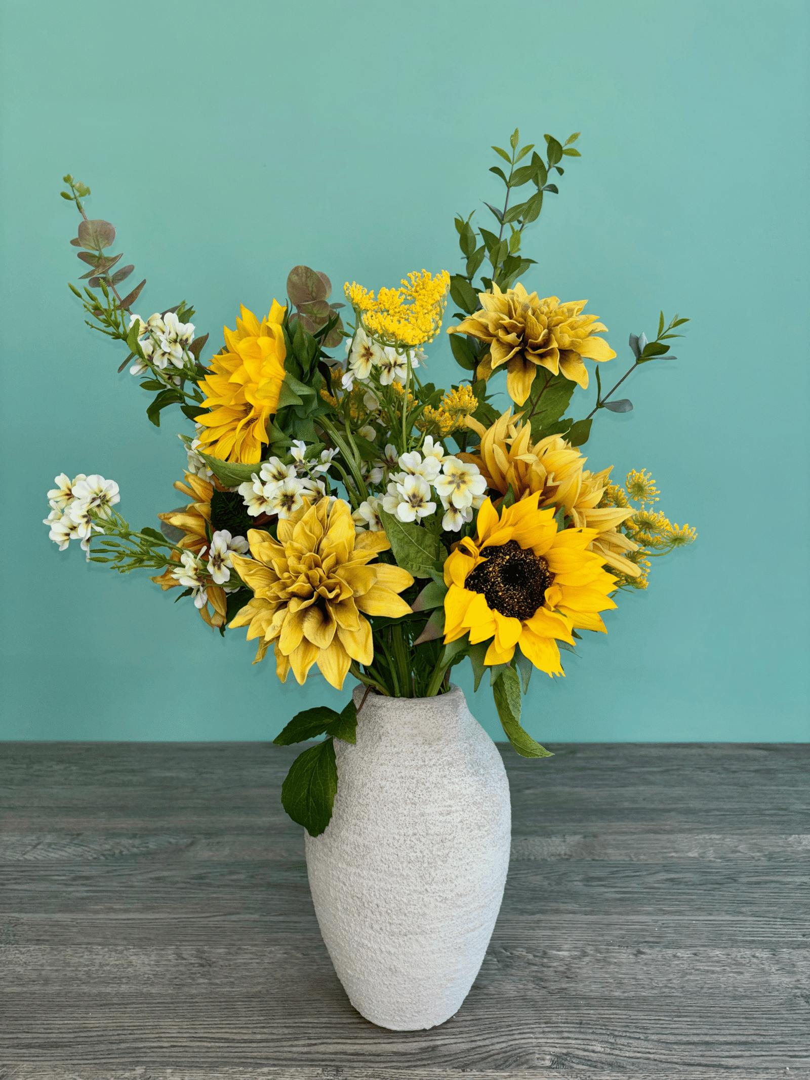 Illuminate your space with Golden Radiance, a vibrant premium faux floral arrangement from Cozy Corner Boutique. Inspired by the warmth of sun-drenched afternoons, this striking composition blends bold sunflowers, rich golden dahlias, soft ivory blossoms, and delicate botanical accents to create a look that feels both joyful and refined.
